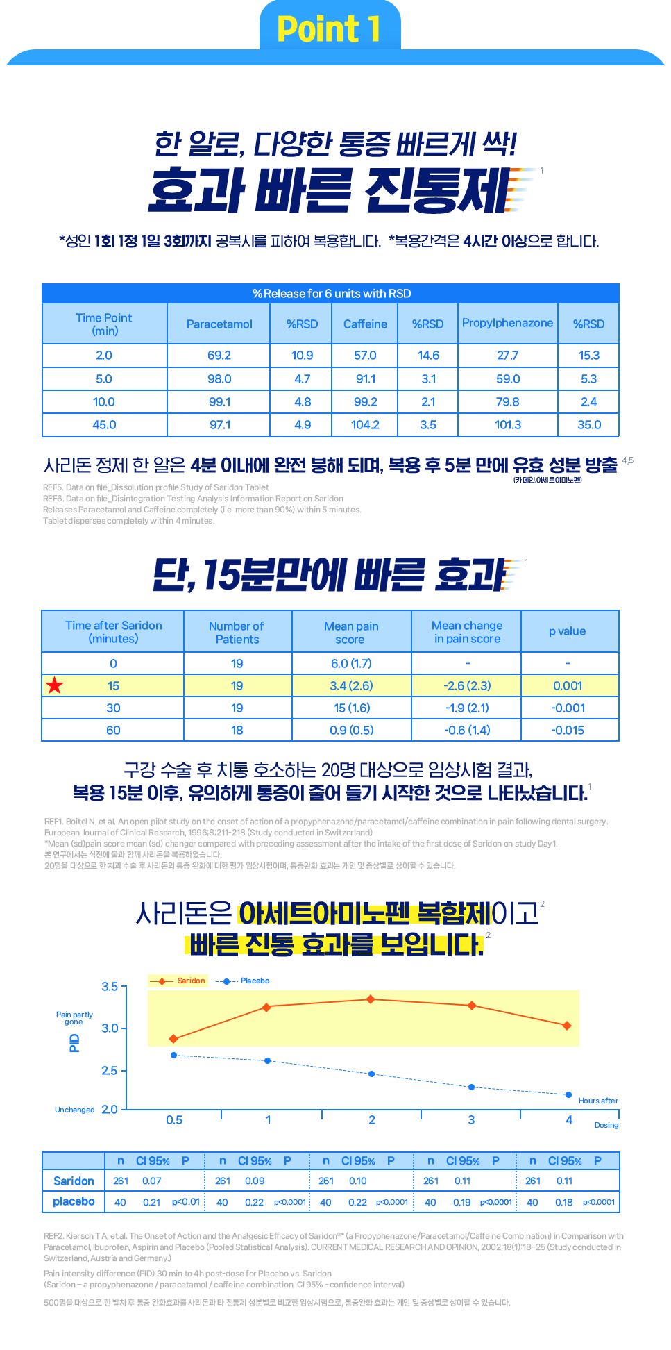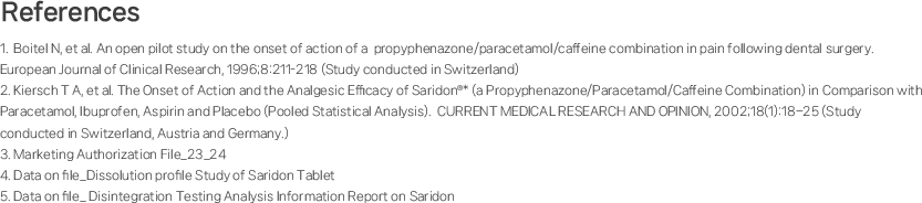 Ref 1. 20명을 대상으로 한 치과 수술 후 사리돈의 통증 완화에 대한 평가 임상시험이며, 통증완화 효과는 개인 및 증상별로 상이할 수 있습니다.
