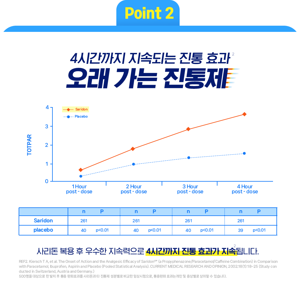 사리돈 복용 후 우수한 지속력으로 4시간까지 진통 효과가 지속([2])됩니다.