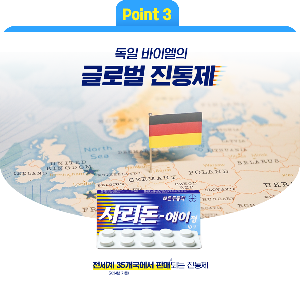 160년 전통 독일 바이엘의 연구진이 개발한 진통제. ([4]) 전세계 37개국에서 판매 되는 오리지널 의약품. ([3]) (2020년 기준)