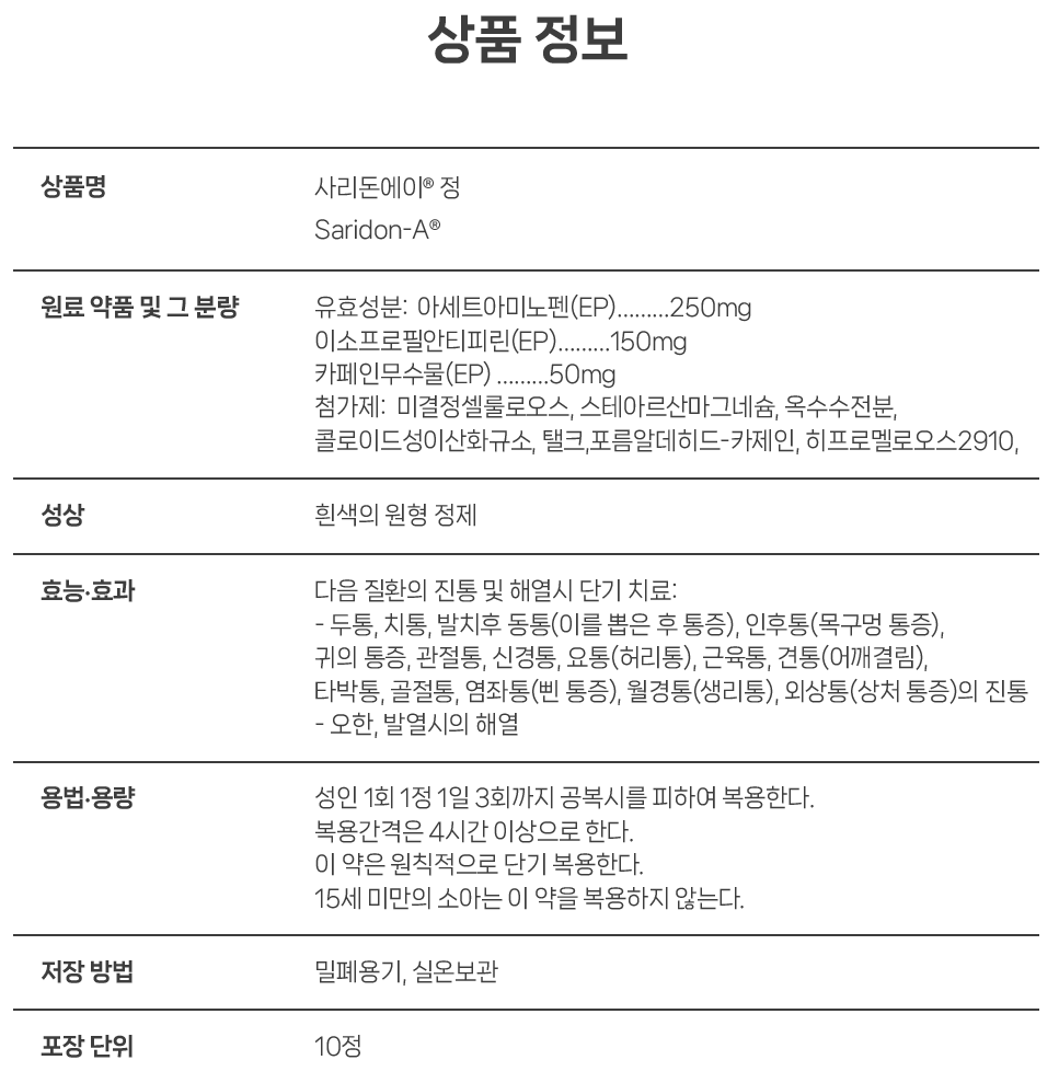 사리돈은 아세트아미노펜 복합제로서 빠른 진통 효과를 보입니다. ([1],[2])