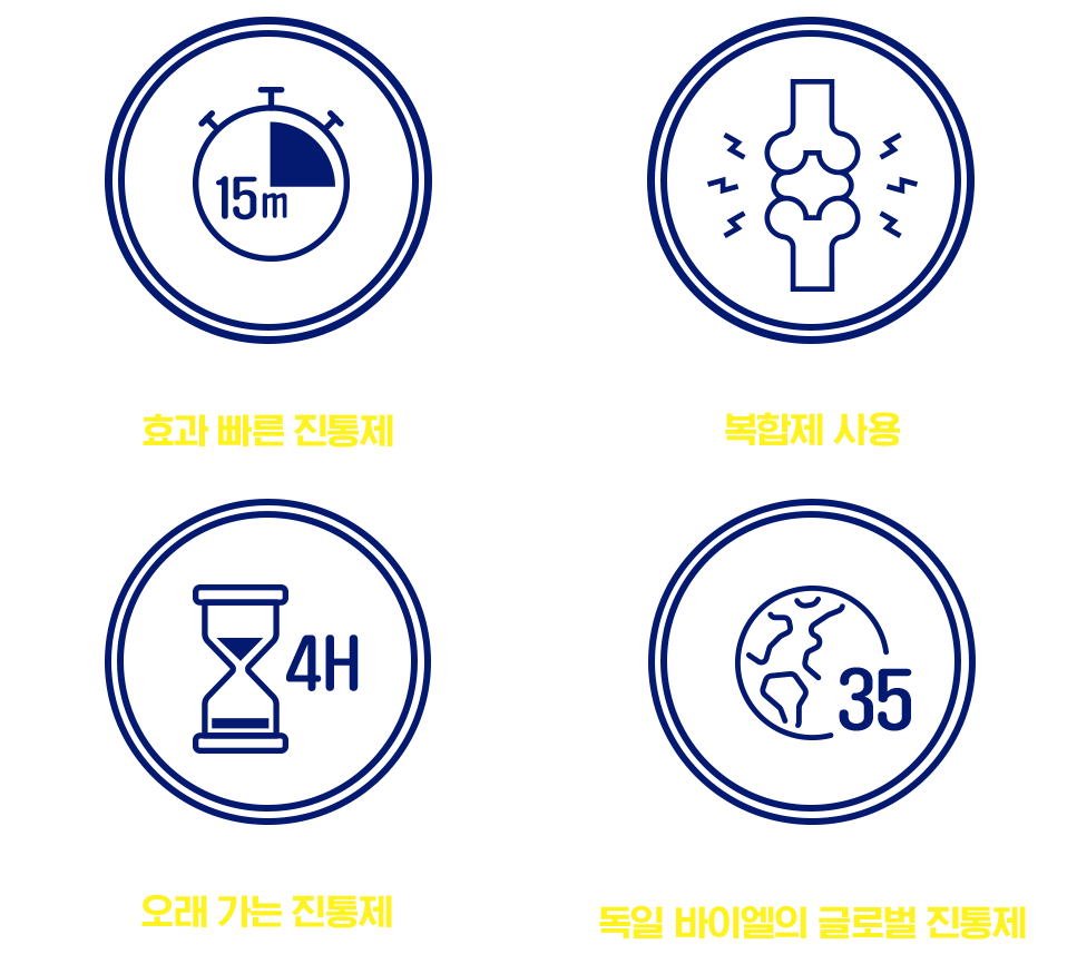 160년 전통 독일 바이엘의 연구진이 개발한 진통제. ([4]) 전세계 37개국에서 판매 되는 오리지널 의약품. ([3]) (2020년 기준)